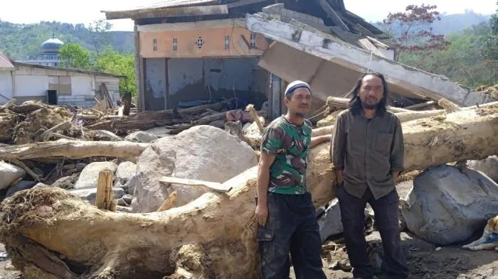 Patahan kayu dinding rumah berhamburan. Atap berwarna biru bagian teras nyaris roboh.