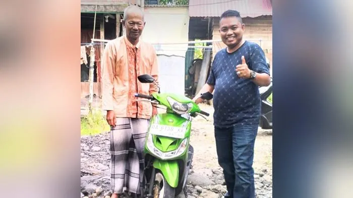 “Alhamdulillah ulun ada rezeki sagan kai, mudah-mudahan sepeda motor ini bisa membantu pian untuk kembali berjualan,” ujar Mama Deden saat menyerahkan bantuan. Senin (26/01/2026).