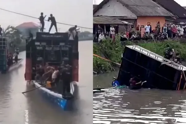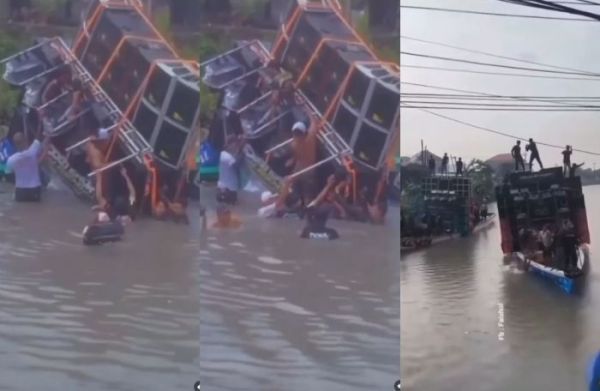 Namun siapa sangka, saat perjalanan, tetiba perahu pengangkut sound horeg itu mendadak oleng ke kanan dan ke kiri. Setelah kehilangan keseimbangan, sound horeg itu langsung jatuh dan tenggelam.