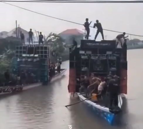 Belum lagi, perahu itu juga dinaiki oleh lebih dari 10 orang. 1O orang itu sempat berjoget saat sound system memainkan alunan musik selama melintas di bantaran Sungai Balongdowo.
