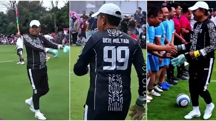 - Aksi tak biasa ditampilkan Gubernur Jawa Barat, Dedi Mulyadi dengan berubah wujud layaknya kiper di laga tarkam (antar kampung).