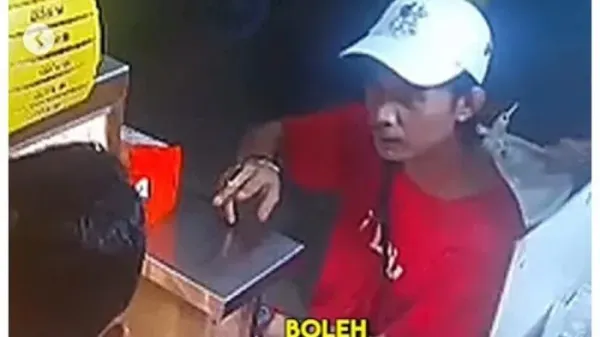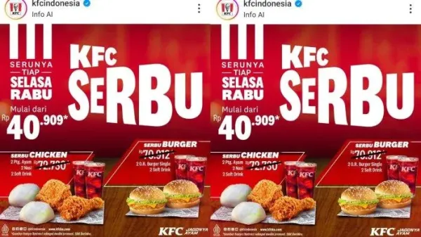 "Minta ayam dua boleh? Bisa?" Tanya tanya pria berbaju merah kepada pelayan outlet makanan cepat saji.